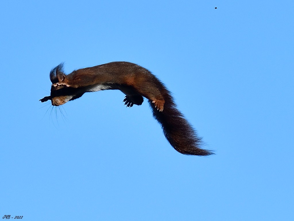 Cet écureuil est monté au sommet du conifère. Il a calculé les distances et s’est envolé sans élan…
