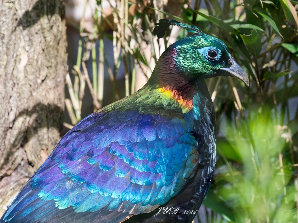 Le lophophore resplendissant montre un plumage aux couleurs métalliques spectaculaires. Du rouge, du vert, du bleu, du pourpre. De quoi faire pâlir un artiste peintre. Quand la lumière est là…