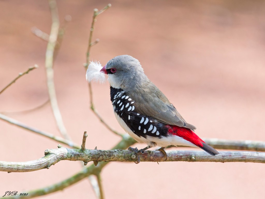 Comme chez tous les Estrildidae, la plume joue un rôle majeur chez le Diamant à gouttelettes – Diamond Firetail